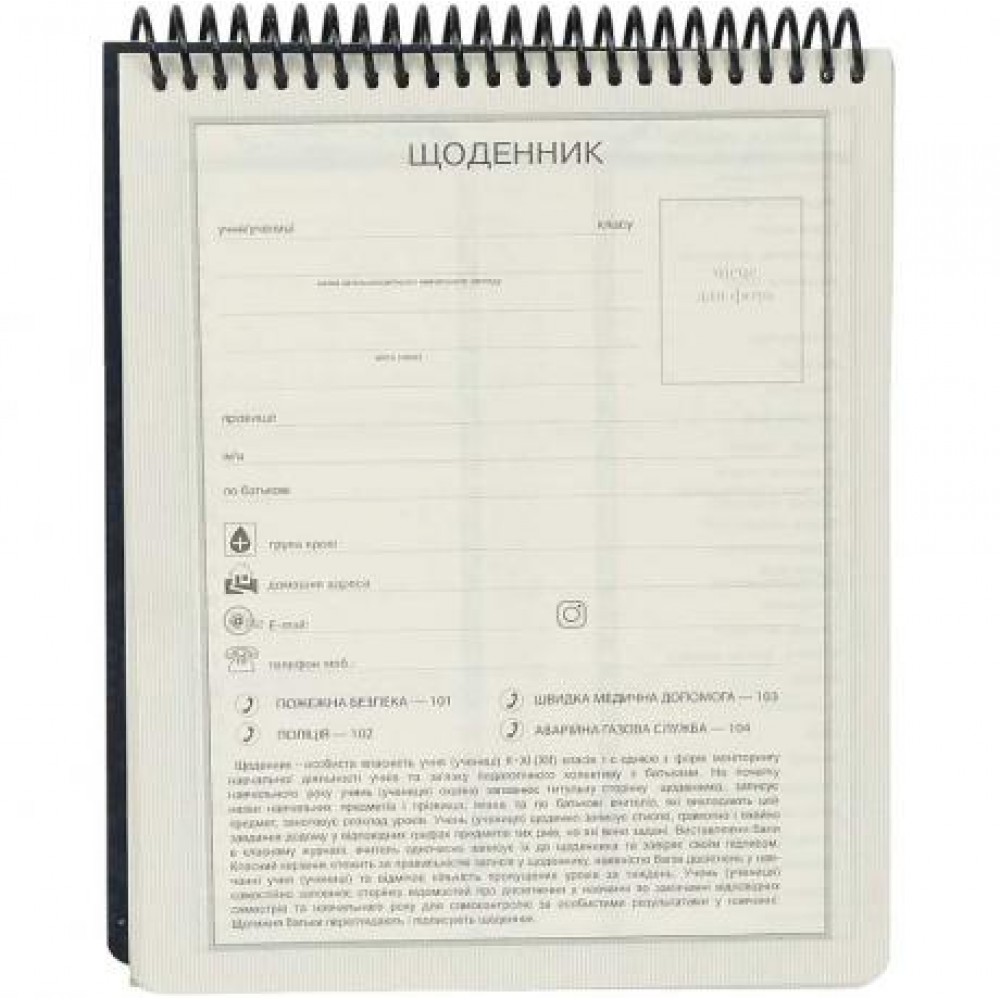 Щоденник шкільний 165*208 mm. 40 арк. Обкладинка з картону 500g/m2 на СПІРАЛІ (одинарна ПЛАСТИКОВА спіраль, товщина дроту 2 мм, діаметр кілець 1,5 см).Папір кремового кольору 70г/м2, друк 1+1, на Українській мові. Повнокольоровий друк 4+0 та матова ламінація. Індивідуальне пакування в прозорому пакетi зі стікером