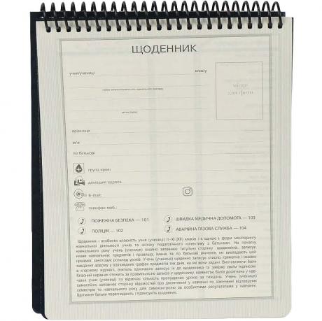 Щоденник шкільний 165*208 mm. 40 арк. Пластикова прозора обкладинка 350мікрон на СПІРАЛІ (одинарна ПЛАСТИКОВА спіраль, товщина дроту 2 мм, діаметр кілець 1,5 см).Папір кремового кольору 70г/м2, друк 1+1, на Українській мові. ОДНО-кольоровий друк (1+0) кольорами PANTONE. Індивідуальне пакування в прозорому пакетi зі стікером