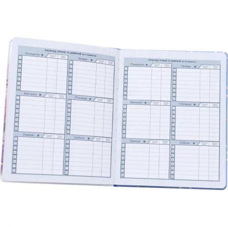 ЩОДЕННИК Шкільний 168x213мм, 48 аркушів, офсет 70г/м2, блок однокольоровий на Українській мові. Обкладинка КОЖЗАМ, заокруглення кутів. Повнокольоровий друк Яскравими фарбами. Форзац чистий. Індивідуальне упакування в прозорий пакет.