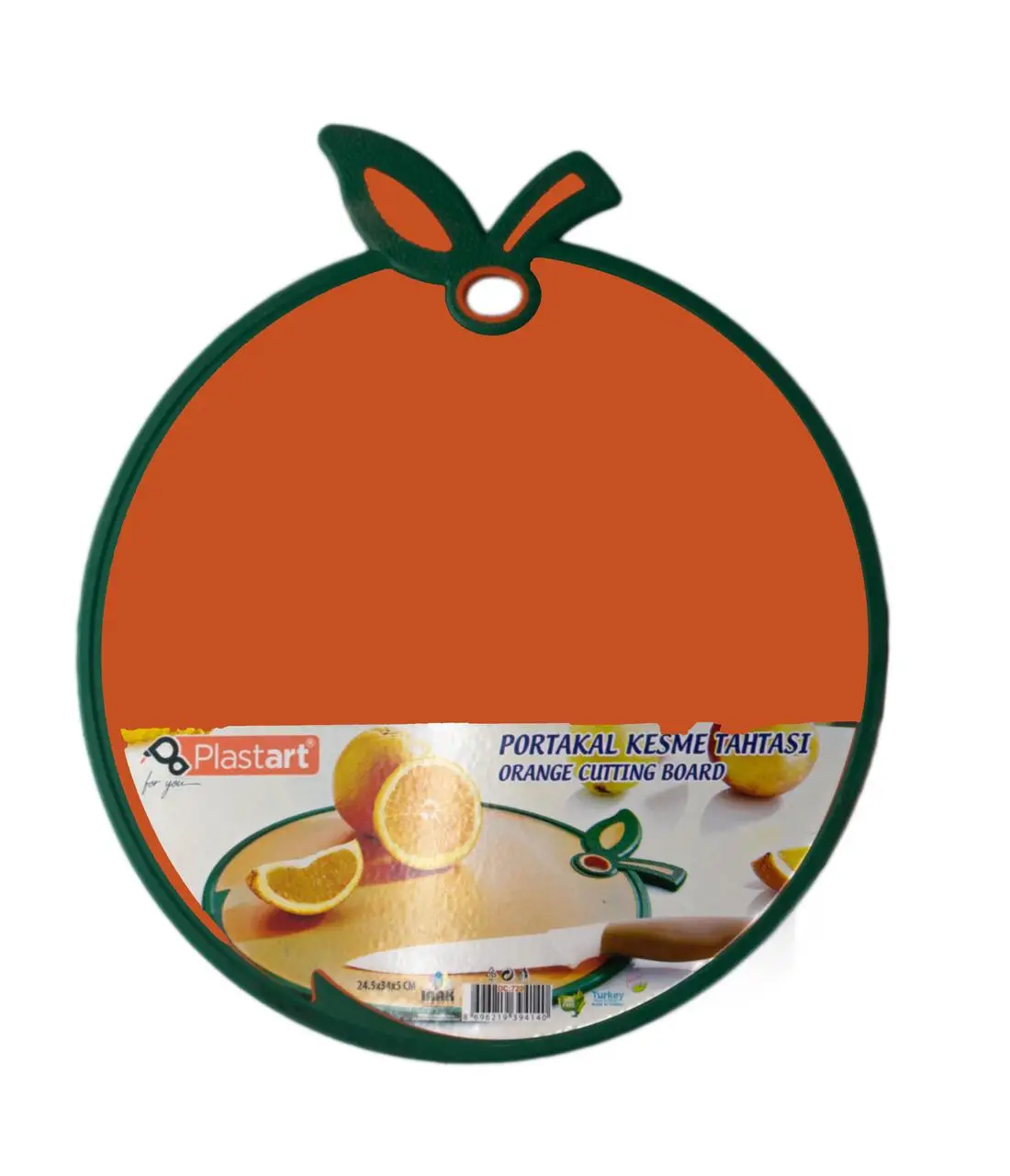 С помощью функциональной разделочной доски Вы сможете с легкостью завершить Ваше блюдо. Доска выполнена в форме апельсина - практичный и яркий атрибут на кухне. Прорезиненные края, предотвращают скольжение по столу, имеется отверстие для подвешивания. Изготовлена из качественного пластика, предназначенного для контакта с пищевыми продуктами.