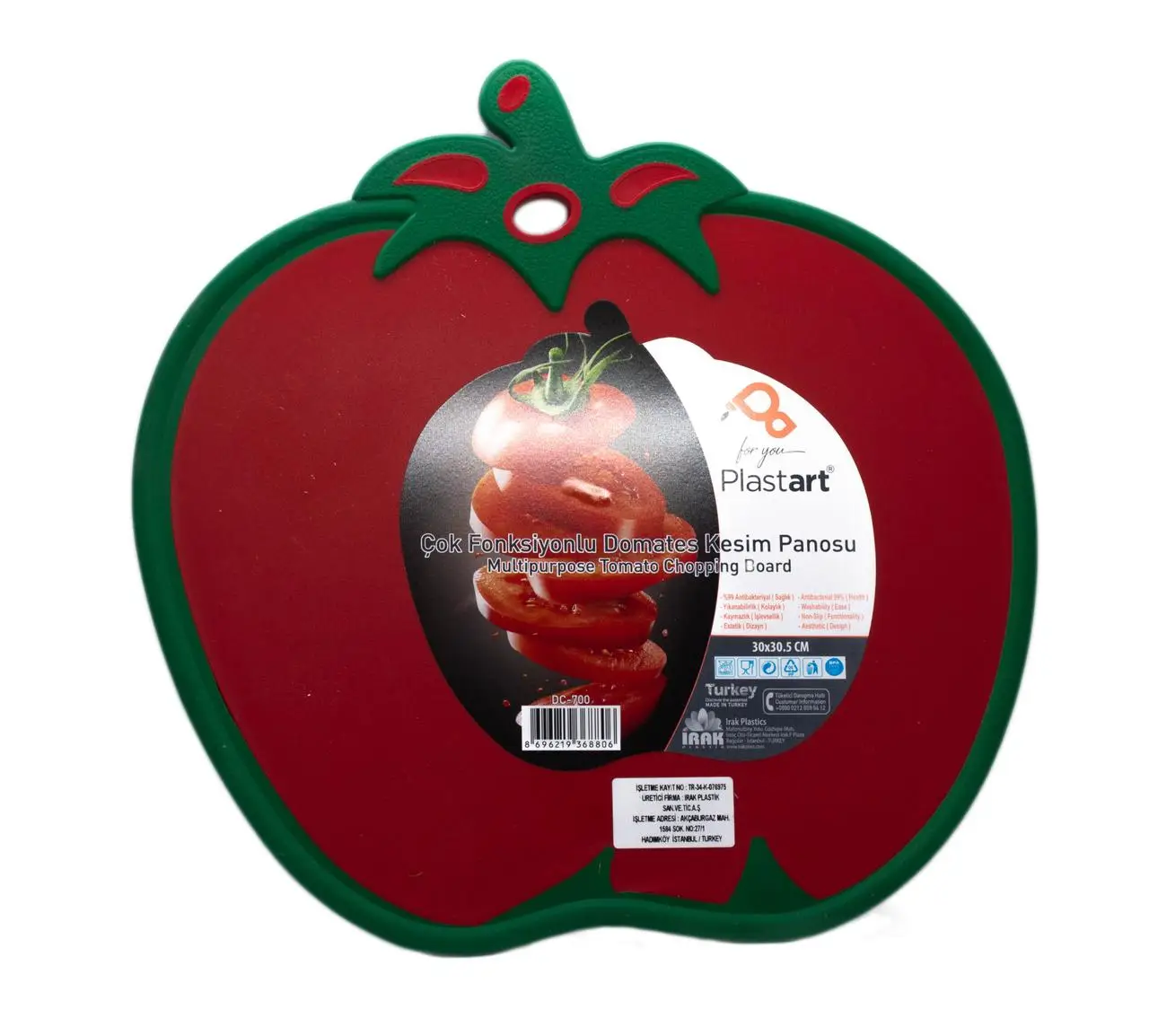 С помощью функциональной разделочной доски Вы сможете с легкостью завершить Ваше блюдо. Доска выполнена в форме томата - практичный и яркий атрибут на кухне. Прорезиненные края, предотвращают скольжение по столу, имеется отверстие для подвешивания. Изготовлена из качественного пластика, предназначенного для контакта с пищевыми продуктами.
