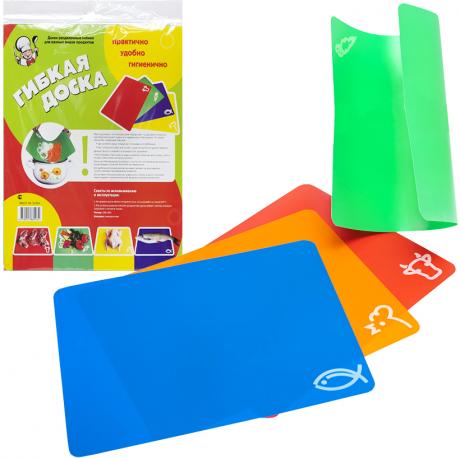Набір гнучких обробних дощок призначений для нарізання та підготовки продуктів на кухні. Розмір однієї дошки — 34×27 см. У наборі — 4 шт. Дошки виготовлені з харчового пластику — поліпропілену РР, гнучка конструкція дозволяє зручно пересипати нарізані продукти у посуд. Підходять для обробки овочів, фруктів, м’яса та інших продуктів. Компактний набір зручний для щоденного використання на кухні. Ціна вказана за набір. Товар вигідний для оптових магазинів і підходить для роздрібного продажу.