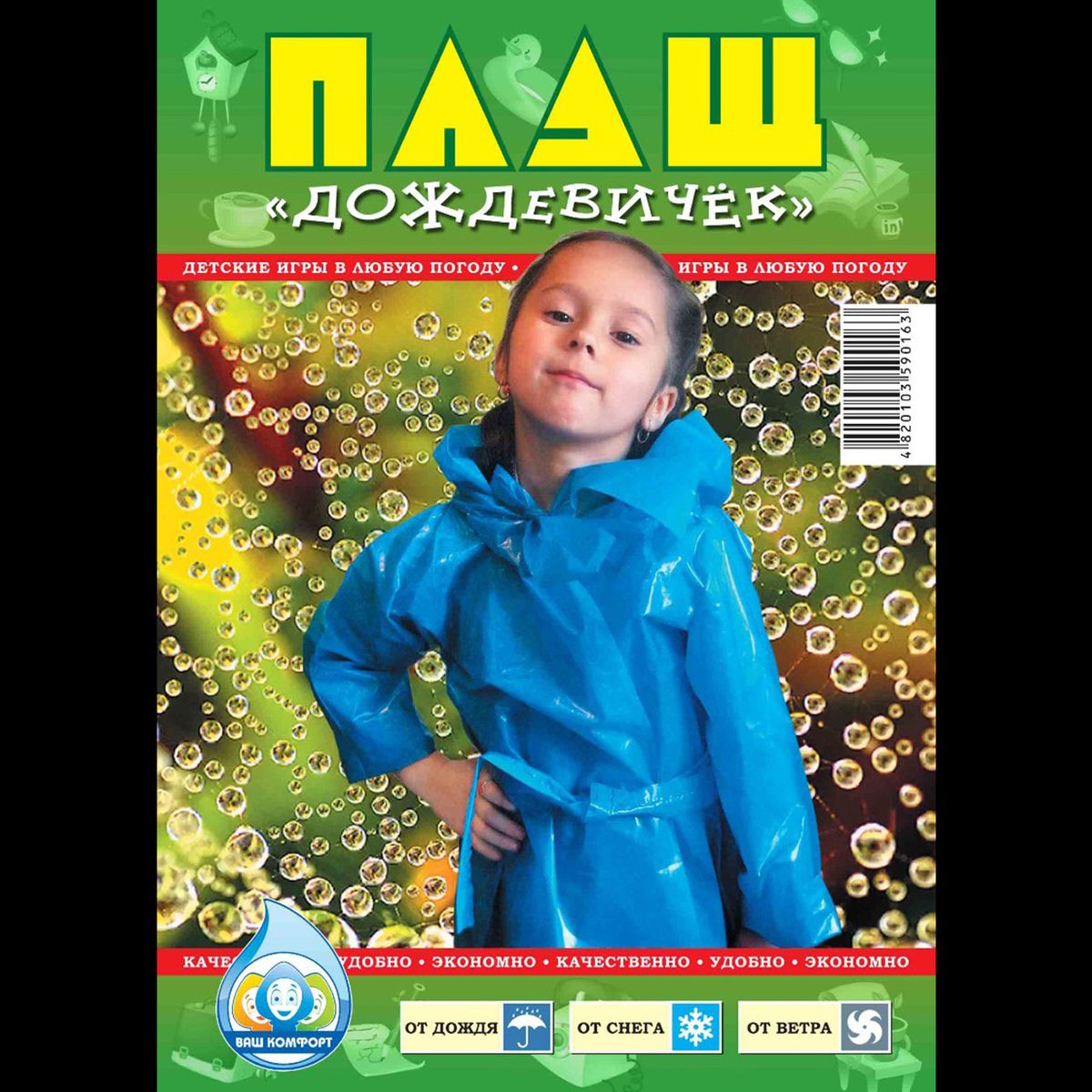 Детские дождевики, благодаря своей плотности и свойствам полиэтилена ПВХ эластичны при зацепе, например за сучок. Материал, прежде чем порваться, сначала растянется. Изделия изготовлены методом сварки - не имеют швов, которые могут протечь. Материал не теряет эластичности до -5С, что позволяет прятаться от мокрого снега. Размер дождевика L, одевается как халат, завязывается на талии поясом, длина плаща от дождя - ниже колен.