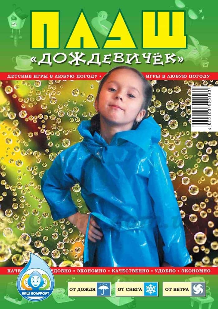 Данный плащ дождевик изготовлен из плотного полиэтилена. Данная модель плаща дождевика рассчитана для детей в среднем от 5 до 7 лет. У данной модели дождевика есть пояс на талии и завязки под шеей. Имеются различные цвета данных плащей.