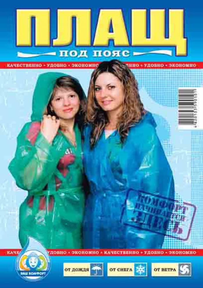 В отличии от зонта, одевая плащ дождевик руки остаются свободны. Плащ имеет пояс, который завязывается на талии. Длина плаща – ниже колен