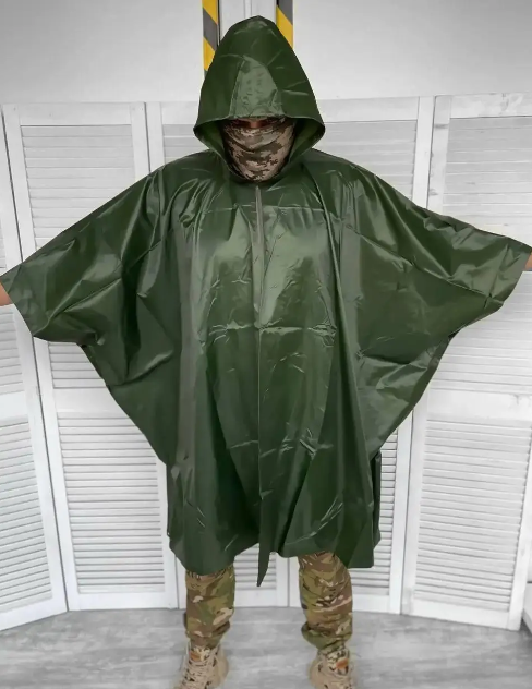 Дождевик изготовлен в защитной окраске олива, что делает его хорошим вариантом для охоты и рыбалки.