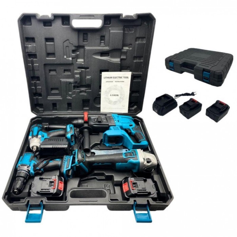 Набор инструментов 4 в 1 - комплект электроинструментов в чемодане, который включает в себя гайковерт, дрель-шуруповерт, перфоратор и угловую шлифмашину. Все инструменты изготовлены из качественных материалов и обладают высокой производительностью. Комплектация: Угловая шлеф машина (Болгарка). Перфоратор . Гайковёрт . Шуруповёрт . Аккумуляторные батареи - 2 шт. Рукоять для болгарки . Защитный кожух для болгарки . Ключ для болгарки . Рукоять для перфоратора. Док-станция для подзарядки АКБ.