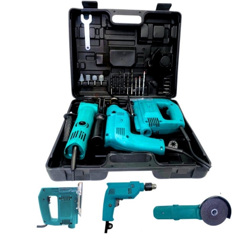 Набор 3 в 1- это незаменимый набор устройств в каждом доме или на даче. Комплект содержит в себе 3 электроинструмента и укомплектован сверлами и насадками. Данный набор инструмент предназначен для отвинчивания - завинчивания шурупов, винтов, болтов, а также сверления отверстий в древесине, металле, гипсокартоне и пластмассе. Комплектация: Болгарка. Лобзик. Дрель. Рукоять. Защитный кожух. Защитная насадка. Отвертка. Прорезиненная рукоятка. Ключ . Транспортировочный кейс