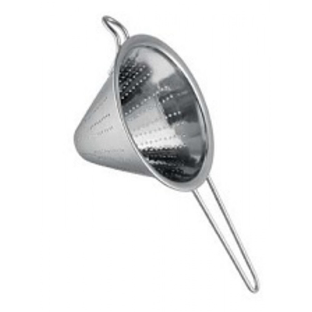 Друшляк конічний з широкою окантовкою виконаний з високоякісної нержавіючої сталі та оснащений зручною прямою ручкою, є петелька для підвішування.