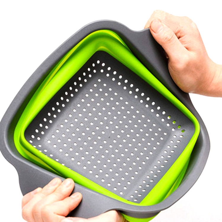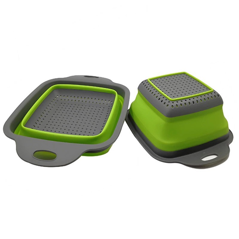 Силиконовый складной друшлаг квадратной формы! Друшлаг имеет стильный серый цвет с зелеными акцентами, добавляющими нотку яркости на вашей кухне.