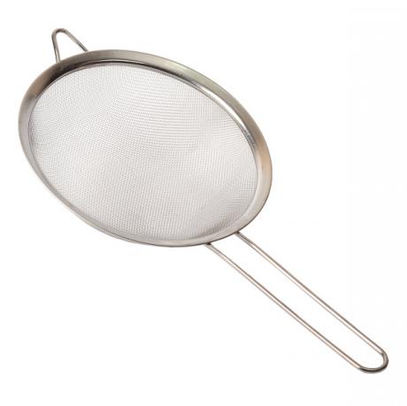 Сито з широкою облямівкою та ручкою. Виготовлене з харчової нержавіючої сталі. Має кільце для підвішування на кухонних аксесуарах. Діаметр 18 см.