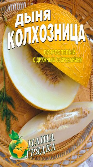 Дыня Колхозница Среднеспелый сорт дыни, урожайный. Плоды округлые гладкие, сетка не полная, крупноячеистая, рисунка нет. Фон темно-зеленый или желто-оранжевый. Мякоть тонкая, белая, вязкая, плотная, очень сладкая, сочная, вкусная.
