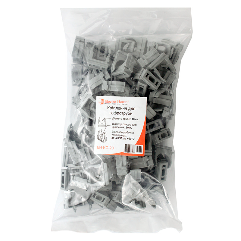 Крепеж для гофротрубы Ø 16 мм Ø5 мм 100 шт/уп. EH-KG-16 - полезное изделие, необходимое при электромонтаже. Можно применять для закрепления гофрированных труб, правильно подобранных по диаметру. Выполнен из высокопрочного, огнеустойчивого и износостойкого пластика. Устанавливается путем крепления к стене или потолку при помощи самореза или шурупа. Представлен в виде U-образной клипсы, в которую легко вставить трубу, при этом она будет надежно держаться и есть возможность в любое время ее извлечь. Благодаря прочным ребрам жесткости обеспечивается хороший захват закрепляемого изделия. Способен перенести различные внешние воздействия, в том числе высокие и низкие температуры, поэтому не трескается на холоде и не расплавляется при жаре. Срок эксплуатации достаточно продолжительный благодаря материалам, из которого он изготовлен. Купить крепеж для гофротрубы можно у нас на сайте по приемлемой стоимости.