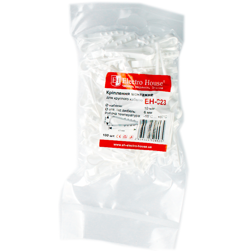Крепление монтажное для круглого кабеля Ø10мм Øпод дюбель 6мм 100 шт/ уп EH-C23 используют для прикрепления к поверхности стены круглых электрокабелей в диаметре 10 мм. Закрепляется в отверстии стены как дюбель, потому имеет соответствующую форму елочки (с боковыми распорками). Для установки предварительно подготавливают отверстие в стене. Монтаж нет требует много усилий, только самый необходимый инструмент. Популярен благодаря своей долговечности, надежности и универсальности. Очень простое в эксплуатации и можно быстро прикрепить провод, при этом он не будет проворачиваться как-либо и перемещаться. Сделан из высококачественного нейлона, который переносит высокую влажность, повышенные температуры, воздействие щелочей и так далее. Купить крепление монтажное EH-C23 по недорогой стоимости можно на нашем сайте.