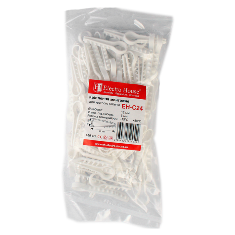 Крепление монтажное для круглого кабеля Ø12мм Øпод дюбель 6мм 100 шт/ уп EH-C24 - отличное приспособления для закрепления электропроводов на месте. Напоминает зажим с дюбелем, еще называют крепление-елочка. Производится из нейлона, который характеризуется высокими огнеупорными и прочными свойствами, а также переносит повышенные температурные режимы и выдерживает воздействие щелочей. Подходит для проводов с круглым сечением в диаметре 12 мм. Фиксируется в стене при помощи распорных элементов, под которые заранее необходимо подготовить отверстие. Благодаря данному крепежу провод не проворачивается и не перемещается. В эксплуатации проявляет наиболее надежные и долговечные качества. Осуществить его монтаж довольно легко, для этого не нужно будет лишних усилий. Купить монтажное крепление EH-C24 можно на нашем сайте по недорогой стоимости.