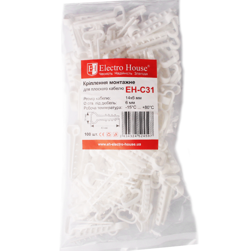 Крепление монтажное для плоского кабеля 14х6 мм Ø отв. под дюбель 6мм 100 шт/ уп EH-C31 используется для электромонтажа проводов, имеющих плоское сечение с размерами 14 на 6 миллиметров. Данное приспособление позволяет быстро совершить закрепление электропроводов на месте и более надежно прикрепить их к поверхности стены, чтобы кабель не перемещался и не проворачивался. По форме напоминает дюбель-елочку, который имеет зажим под электрокабель. Фиксируется в заранее подготовленном отверстии стены при помощи боковых распорных элементов. Изготовлен из высококачественного нейлона, который отличается своими прочными и огнеупорными характеристиками. Устойчив ко внешним влияниям окружающей среды, в том числе к температурным перепадам, влажности, воздействиям щелочей и так далее. Купить крепление монтажное EH-C31 можно у нас на сайте по низкой стоимости.