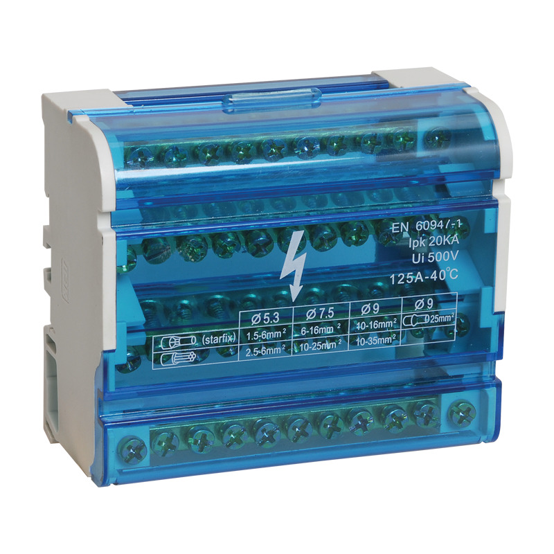 Шина нулевая в корпусе (кросс-модуль) EH-BNS4х11 от компании "ElectroHouse" предназначена для электрического и механического соединения нулевых, защитных и фазных проводников. Она имеет корпус из термостойкого самозатухающего пластика в котором размещены нулевые шины изолированные друг от друга перегородками и откидную крышку из прозрачного пластика, которая позволяет визуально контролировать качество соединения проводов, а так же предотвращает случайное попадание посторонних предметов. Так же крышка дает защиту от случайного прикосновения к токоведущим частям модуля. Кросс-модуль имеет современный эстетичный вид и компактные размеры. Благодаря использованию этого устройства разводка кабелей в электрощите или электрошкафу станет не только более безопасной и компактной, но и приобретет более эстетичный вид. Благодаря наглядности распределения кабелей, которую дает кросс-модуль, ремонтные или монтажные работы будут занимать гораздо меньше времени. Шина нулевая в корпусе имеет крепление для установки на DIN рейку, что позволяет ее установить в течение нескольких секунд. Провода фиксируются в нулевой шине с помощью винтов, что делает соединение надежным и позволяет использовать это устройство многократно.Благодаря конструктивным особенностям кросс-модуль можно использовать и как переходной клеммник для кабеля большего сечения если необходимо подключить несколько кабелей меньшего сечения, что практично и удобно.Эта модель кросс-модуля состоит из четырех нулевых шин, каждая из которых содержит по одиннадцать кабельных выводов. Диаметр кабельных выводов: 2х 8,5 мм, 2х7,5 и 7х6 мм мм для каждой шины. Ее номинальный ток - 125А. Рабочая температура для этого изделия от -40 до 50оС при среднем значении относительной влажности не более 90%. Сечение подключаемых проводников 2,5 – 16 мм2 . Имеет класс защиты IP20. Для длительной и надежной эксплуатации нулевой шины окружающий воздух не должен быть засорен парами солей, коррозионными или воспламеняющими газами.