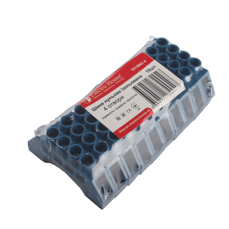 Шина нулевая изолированная EH-BNC-4 на четыре отверстия от компании "ElectroHouse" предназначена для электрического и механического соединения нулевых, защитных и фазных проводников. Отличается высоким качеством, надежностью и долговечностью. Соответствует мировым и европейским стандартам качества.На сегодняшний день просто невозможно представить сборку электрощита без применения подобных устройств. Конструктивно эта модель представляет собой токопроводящую жилу в изолирующем корпусе из самозатухающего пластика. Токопроводящая жила изготовлена из электротехнической латуни и содержит в себе отверстия с зажимными винтами для крепления в ней проводников (четыре кабельных вывода диаметром 5,5 мм). Ширина - 11 мм, длина - 66 мм. Номинальный ток для этой модели - 100А. Рабочая температура для этого изделия от -40 до 50оС при среднем значении относительной влажности не более 90. Для длительной и надежной эксплуатации этого изделия окружающий воздух не должен быть засорен парами солей, коррозионными или воспламеняющими газами.Для обеспечения качественного соединения, а также упрощения дальнейшего обслуживания, шина выполнена единым токопроводящим элементом. Сам корпус имеет два отверстия для винтового крепления на поверхность.Для правильного функционирования устройств дифференциальной защиты необходимо правильно произвести их подключение, а в распределительном щите разделить проводники N от PE. В случае металлического щита, это можно произвести только изолировав нулевой проводник от корпуса. Благодаря конструктивным особенностям, эта модель подойдет для выполнения такой задачи как нельзя лучше - поскольку она уже изолирована корпусом и не требует установки на изолятор. Ее монтаж прост, не занимает много времени и не требует дополнительного оборудования.
