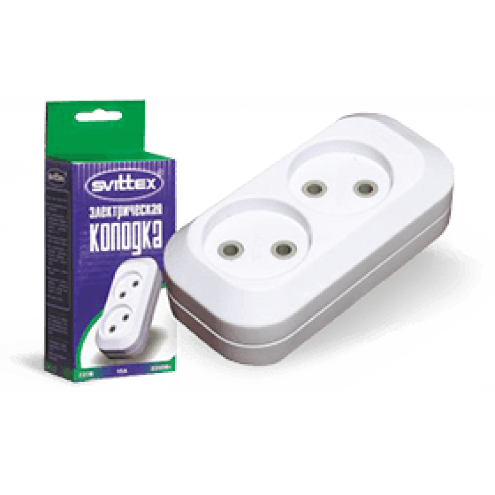 SV-009. Розетка (колодка) SVITTEX двухместная. Напряжение: 220..250 В. Номинальный ток: 10 А. Частота тока: 50/60 Гц. Климатическое исполнение: УХЛ4. Степень защиты: IP 20. Сечение присоед. проводов: от 0,75 до 1,5 мм². Материал корпуса: пластик ABS. Материал вставки: негорючий пластик ABS. Материал контактной группы: латунь. Макс. мощность: 2,2 кВт. Входные розетки: EURO/RUS