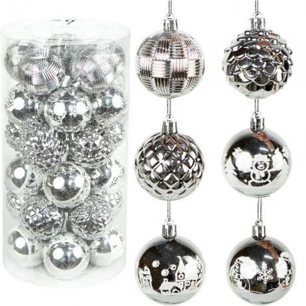 Набір куль — елегантна прикраса для святкового декору. У комплекті 30 куль діаметром 6 см: 15 з малюнком (3 види) та 15 рельєфних (3 види). Усі кулі мають глянцеву поверхню, що красиво відбиває світло та створює урочисте сяйво. Нитки для підвішування йдуть окремо. Упаковано в тубус діаметром 16 см і висотою 31 см, зручний для зберігання та подарункового оформлення.
