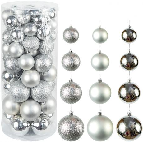 Набір новорічних куль — класична прикраса для ялинки та святкового декору. У комплекті кулі діаметром 5 см — 24 шт., 6 см — 20 шт., 7 см — 16 шт., 8 см — 12 шт. Поверхні мають три варіанти: глянцеві, матові та блискучі, що створює гармонійне поєднання фактур. Кулі упаковані у прозорий тубус діаметром 21 см і висотою 49 см, зручний для зберігання та транспортування. Набір чудово підійде для прикрашання дому, офісу, вітрин і новорічних композицій.