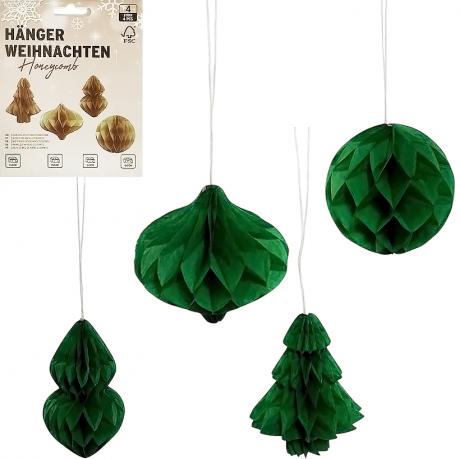 Набір підвісних новорічних прикрас це стильний декор для створення святкової атмосфери. У комплект входять 4 паперові фігурки. Конструкція «стільника» легко розкривається, утворюючи акуратні та легкі прикраси. Їх можна повісити на ялинку, у вікно, на стіну або використовувати для оформлення вітрин. Екологічний матеріал забезпечує безпеку та якість. Відмінний вибір для дому, офісу чи святкового заходу.