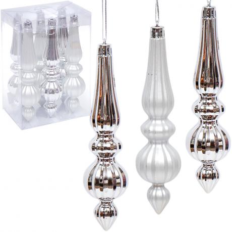 Набір ялинкових прикрас 6279-12S (6 шт.) — стильний комплект підвісних іграшок у срібному кольорі. У наборі 6 пластикових прикрас розміром 17×4 см, виконаних в оригінальній витягнутій формі. У комплект входять три матові та три глянцеві прикраси одного кольору, що гармонійно поєднуються між собою й створюють ефект святкового блиску на ялинці. Виготовлені з легкого, міцного пластику, безпечного для дітей і тварин. Упаковані в прозору пластикову коробочку 12×17×8 см, зручну для зберігання чи як подарунковий варіант. Ціна вказана за набір із 6 штук. Ідеально підходять для декору ялинки, святкових композицій або зимового інтер’єру.