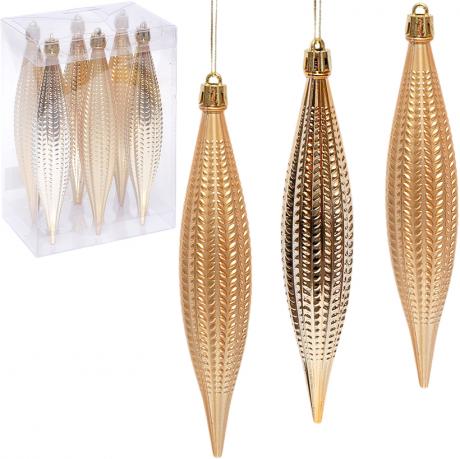 Набір ялинкових прикрас 6279-11G (6 шт.) — стильний комплект підвісних іграшок у класичному золотому кольорі з поєднанням матових і глянцевих поверхонь. У наборі 6 пластикових прикрас довжиною 17 см і діаметром 3,5 см з оригінальним рельєфним візерунком, що створює ефект глибини та м’якого сяйва. Витягнута форма надає прикрасам вишуканості та чудово поєднується з іншими новорічними елементами декору. Виготовлені з легкого, міцного пластику, безпечного для дітей і тварин. Упаковані у прозору пластикову коробку розміром 13×8×18 см. Ціна вказана за набір із 6 штук. Ідеально підходять для декору ялинки, святкових композицій чи інтер’єру.