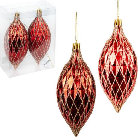 Набір ялинкових прикрас (2 шт.) — вишукані декоративні підвіски з глітером. У комплекті 2 пластикові іграшки розміром 17×6 см, виконані у формі витягнутої краплі з рельєфним візерунком і мерехтливим блиском. Елегантний дизайн надає ялинці вишуканості та святкового сяйва. Прикраси легкі, міцні й безпечні для дітей і тварин. Упаковані у прозору пластикову коробочку розміром 13×17×6,5 см, зручну для зберігання чи подарункового оформлення. Ціна вказана за набір із 2 штук. Ідеально підходять для декору ялинки, святкових композицій або зимового інтер’єру.