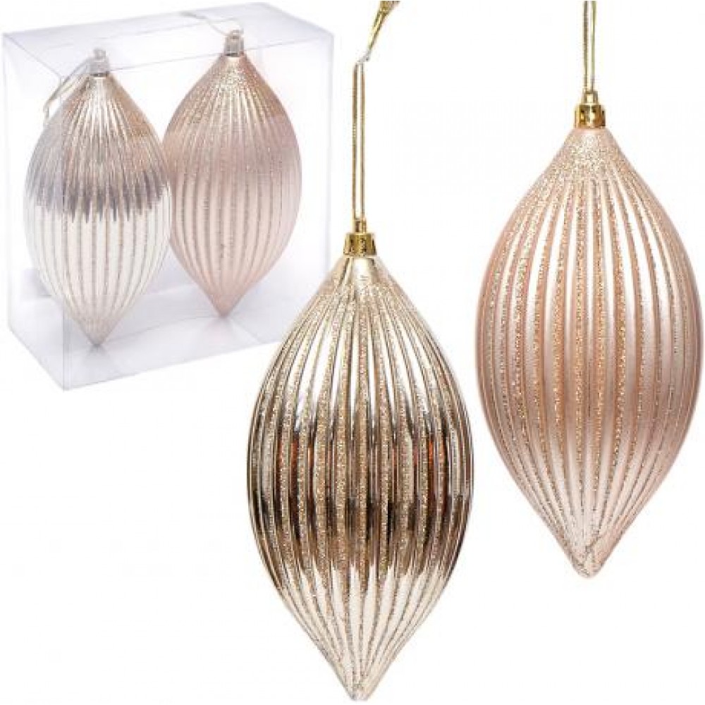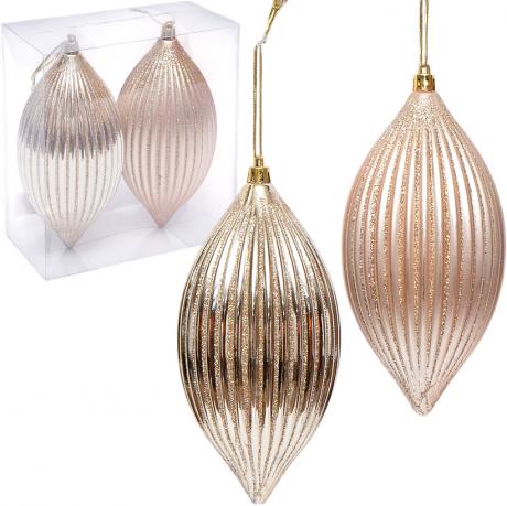 Набір декоративних іграшок — вишукана прикраса для святкового декору. У комплекті 2 вироби подовженої форми з глітерним покриттям, що створює м’яке сяйво. Розмір кожної іграшки 16×8 см, нитки для підвішування йдуть окремо. Упаковані у прозору коробку 16,5×15,5×8 см, зручну для зберігання та подарункового оформлення. Ціна вказана за 2 шт.