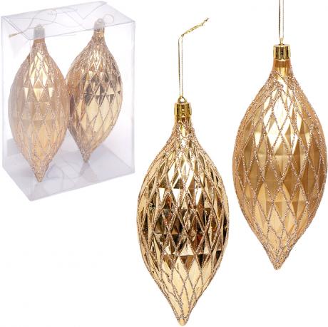 Набір ялинкових прикрас 6279-13G (2 шт.) — вишукані декоративні підвіски у золотому кольорі з глітером. У комплекті 2 пластикові іграшки розміром 17×6 см, виконані у формі витягнутої краплі з рельєфним візерунком і блискучим покриттям. Елегантний дизайн надає ялинці святкового та розкішного вигляду. Прикраси легкі, міцні й безпечні для дітей і тварин. Упаковані у прозору пластикову коробочку розміром 13×17×6,5 см, зручну для зберігання чи подарункового оформлення. Ціна вказана за набір із 2 штук. Ідеально підходять для декору ялинки, інтер’єру чи святкових композицій.