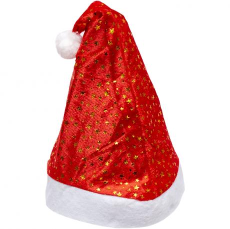 Шапка Діда Мороза з червоної тканини, прикрашена яскравими зірочками та білою окантовкою. Виготовлена з м’якого матеріалу, що забезпечує комфорт. Універсальний розмір з об’ємом 56 см і висотою 37 см підходить для дорослих і підлітків. Використовується на костюмованих вечірках, корпоративних заходах та фотосесіях.