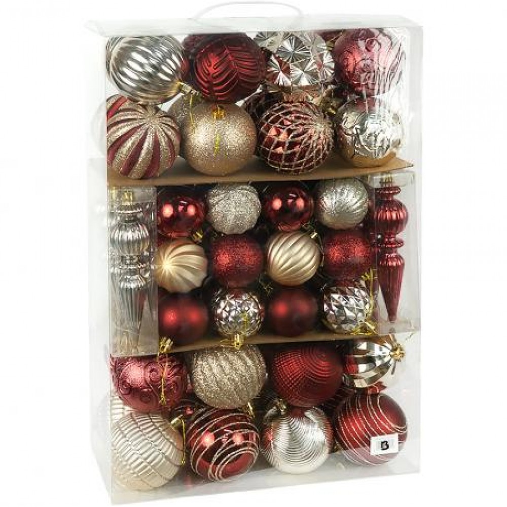 Набір ялинкових прикрас 6279-1B (74 шт.) — елегантний комплект для новорічного декору у теплих відтінках бордо та золота. У наборі: 32 кульки діаметром 7 см, 36 куль діаметром 5 см і 6 видовжених прикрас довжиною 16 см. Кожен елемент має оригінальну фактуру — матову, глянцеву, блискучу або з глітером. Прикраси виготовлені з міцного, легкого пластику, безпечного у використанні вдома, в офісі чи торговому приміщенні. Поєднання кольорів надає ялинці вишуканого святкового вигляду. Упаковані у прозору коробку з ручкою розміром 48×32×16 см, зручну для зберігання чи подарункового оформлення.