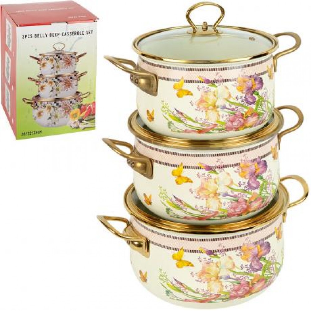 Практичний набір емальованих каструль з 3-х розмірів ідеально підходить для приготування супів, гарнірів, тушкування та зберігання готових страв. Каструлі виготовлені з міцної сталі з якісним емальованим покриттям, стійким до подряпин і перепадів температур. Кришки з жаростійкого скла оснащені отвором для виходу пари.