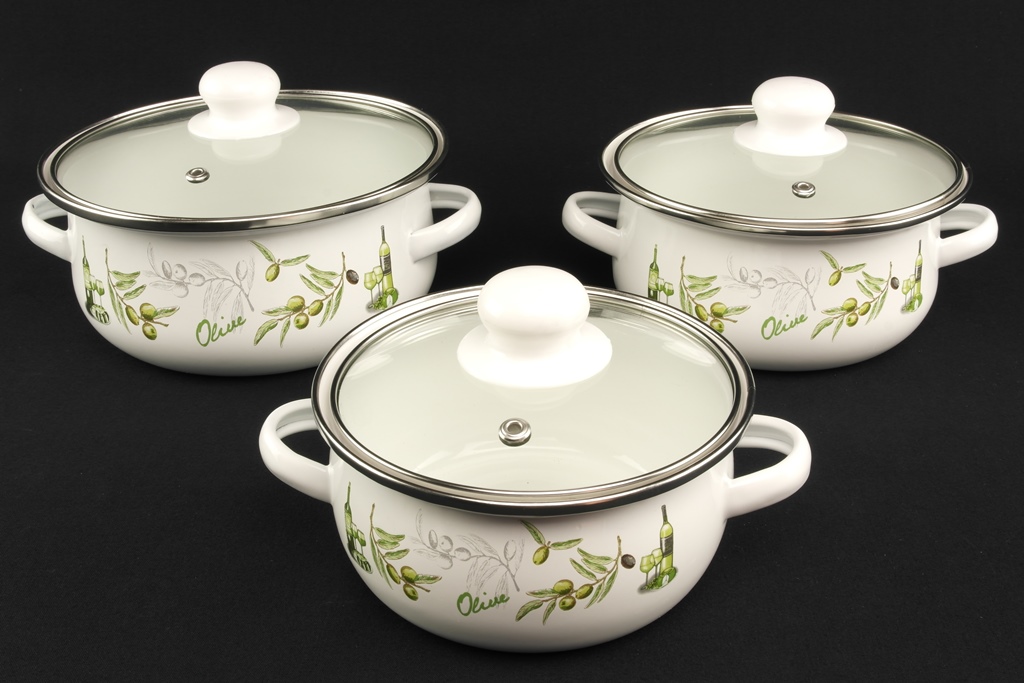 Набор кастрюль - хороший подарок для любой хозяйки. Эмалированные кастрюли экологичны, не впитывают запахи, не меняют вкусовых качеств пищи. Подходят для приготовления первых и вторых блюд, гарниров, соусов и т.д. Крышки из термостойкого стекла с отверстием для выхода пара и ободом из нержавеющей стали. Кастрюли с яркими цветочными рисунками украсят любую кухню. Подходят для всех видов плит.