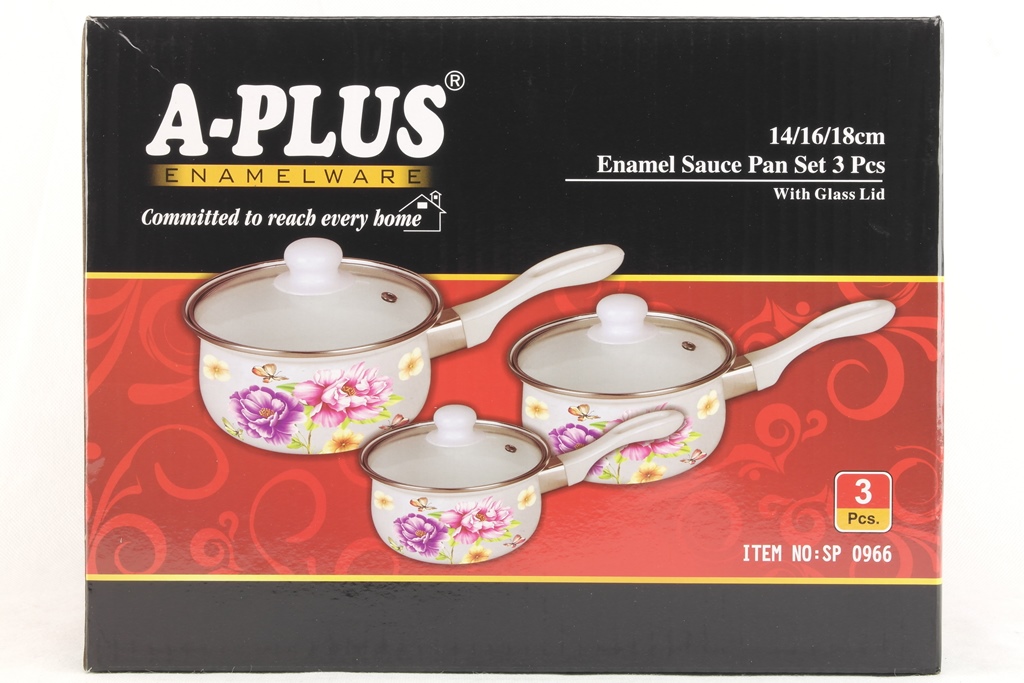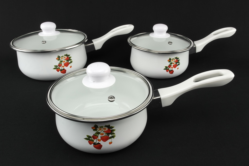 0966 набор ковшиков эмаль со стеклянными крышками компании A-Plus, размеры: