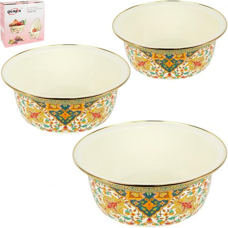 Набір із 3 круглих емальованих мисок Qunjia виготовлений із високоякісної нержавіючої сталі. Внутрішня поверхня стійка до кислот і лугів, не вбирає запахи та легко миється. Емалеве покриття, нанесене при температурі понад 800 °C, надійно захищає метал, забезпечуючи довговічність і гігієнічність посуду.