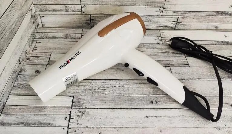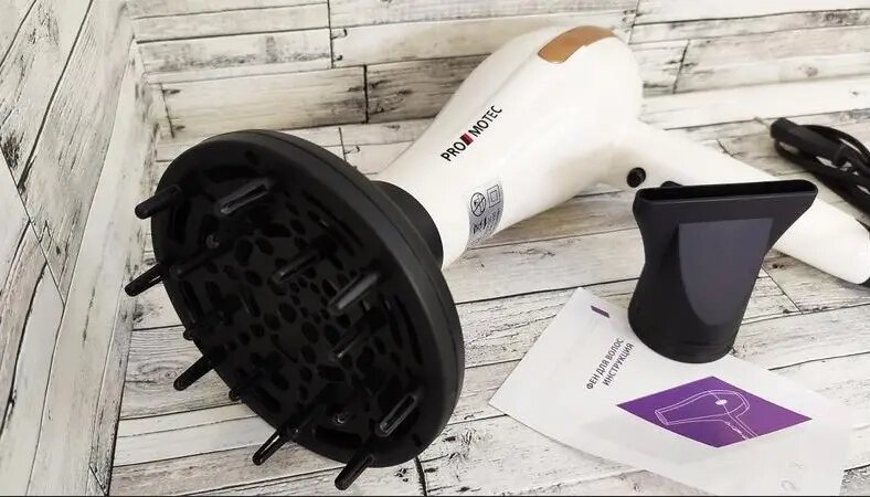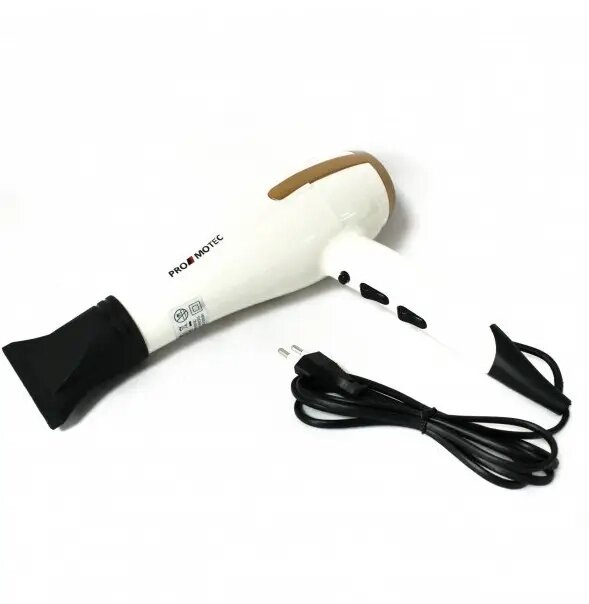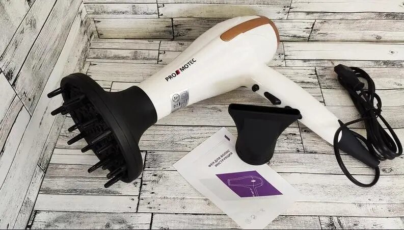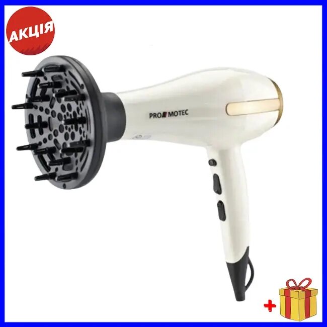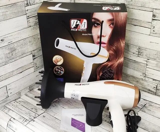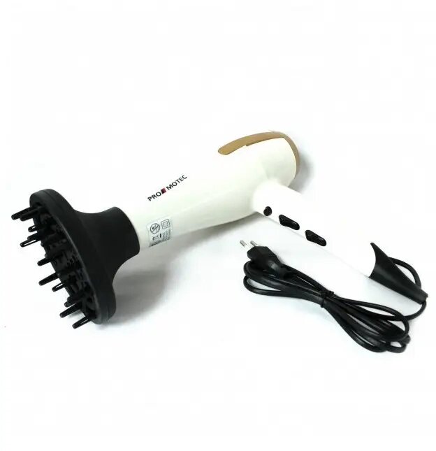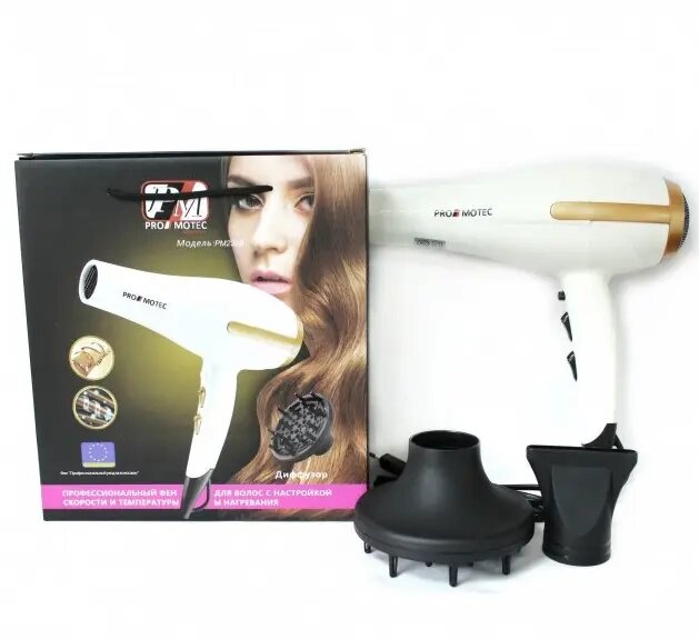 Мощный качественный фен для сушки укладки волос Promotec PM 2305 3000 W диффузорPromotec PM-2305 - это надежный и мощный фен, который предназначен для профессионального использования. Данная модель вобрала в себя только лучшие качества профессионального фена. Это и удобный эргономичный дизайн, и мощный мотор, и три температурных режима. Что еще нужно для создания укладки? Равномерное распределение веса по всему корпусу, позволит использовать его без особой нагрузки на кисть, что имеет значение при длительном использовании.Фен имеет дополнительную функцию ионизации волос, а также кнопку моментального охлаждения, что играет важную роль во время укладки. Promotec PM-2305 выполнен из высококачественного пластика и защищен от перегревания. Все это делает фен долговечным и безопасным в использовании. В комплекте с феном имеется насадка-концентратор и диффузор.