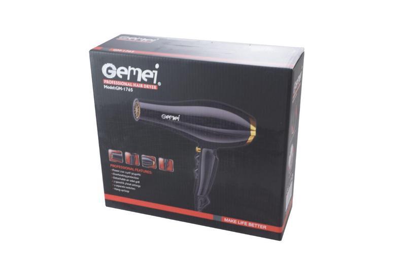 Фен GEMEI GM-1765 2.8 кВт АС - практичный и мощный инструмент, отличается красивым дизайном и доступной ценой с широким набором функций. Он бережно и быстро сушит волосы, также Вы сможете придать волосам эффектную форму и объем, и зафиксировать их с помощью функции "холодный воздух". Благодаря мощности в 2800 Вт, выходящий воздух нагревается практически мгновенно. Вы можете регулировать скорость потока воздуха и температуру нагрева. Отключение модели при перегреве позволит продлить срок его службы и обеспечит его наиболее безопасную эксплуатацию. Характеристики: Мощность: 2800 Вт Количество температурных режимов: 3 Количество режимов работы: 3 Количество скоростей: 2 Количество насадок: 1 Подача холодного воздуха: да Удобство и безопасность Комплектация: фен; насадка 1 шт; упаковка