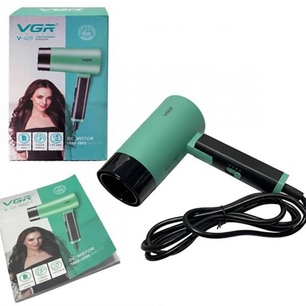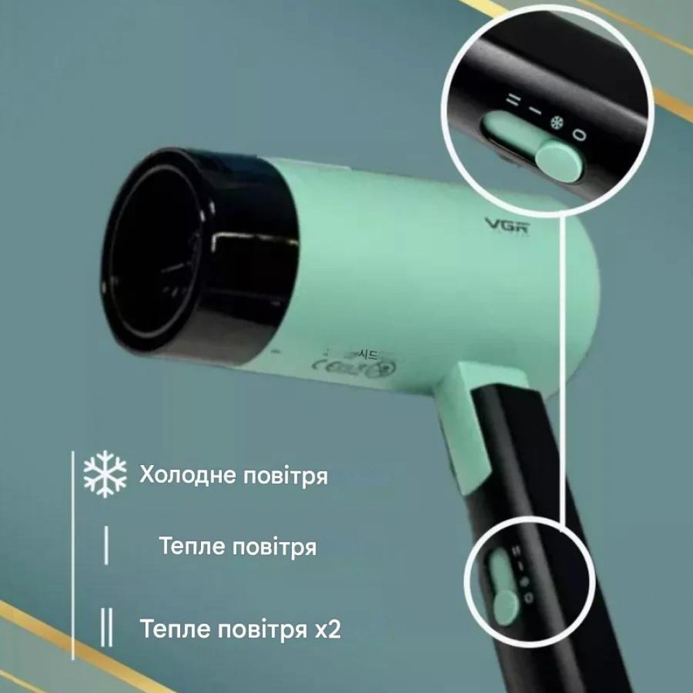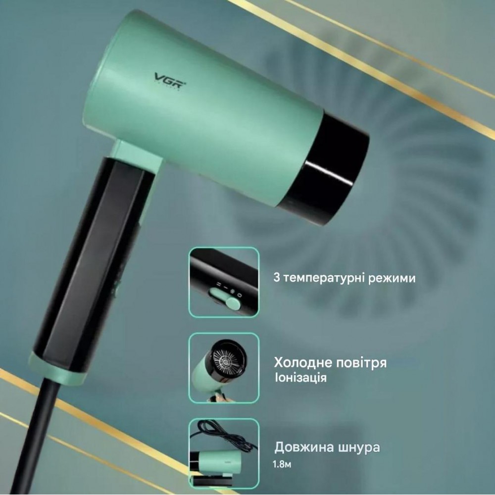 Фен складной VGR V-426 GREEN, 2 уровня обдува, 3 уровня температуры, 1600-2000 Вт