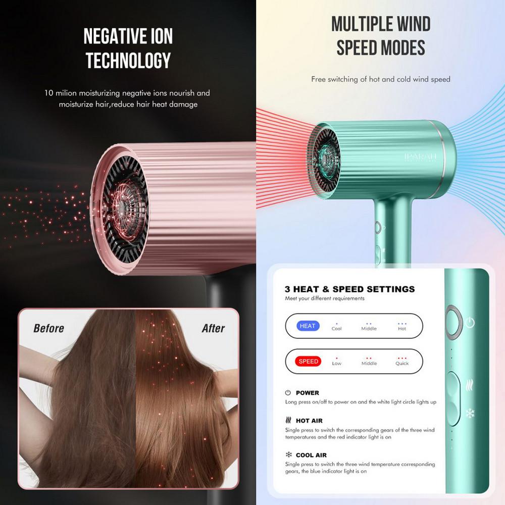 Профессиональный бытовой фен IPARAH P‐300 Hair Care Negative Essential Oil Professional Homehold Hair Dryer for Women – это мощный фен для сушки и укладки волос с продуманными настройками и удобным управлением. Устройство оснащено надежным DC двигателем, который обеспечивает эффективный поток воздуха для быстрой сушки и аккуратной укладки. Регулируемые уровни температуры и скорости воздушного потока позволяют подобрать оптимальные параметры для различных типов волос, а функция холодного воздуха фиксирует прическу после укладки. Прибор создает отрицательные ионы, которые помогают уменьшить статическое электричество, делая волосы более гладкими, мягкими и блестящими. Комплект включает в себя концентратор и запасной флакон с эфирным маслом по уходу за волосами. Такое сочетание характеристик делает фен отличным выбором как для бытового использования, так и для создания салонного стайлинга в домашних условиях.