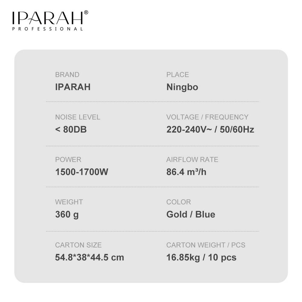 Профессиональный фен для волос IPARAH Professional Hair Dryer - это мощный и эффективный прибор для сушки и укладки волос с профессиональными характеристиками. Благодаря высокопроизводительному AC-мотору фен обеспечивает сильный и равномерный поток воздуха, который сокращает время сушки и позволяет достичь аккуратной ухоженной текстуры волос. Регулируемые уровни скорости обдува и температуры помогают подобрать оптимальный режим для любого типа волос, а функция холодного воздуха фиксирует прическу и придает ей дополнительный блеск. Технология ионизации уменьшает статическое электричество, делая волосы более гладкими и мягкими. Эргономичный корпус и удобное управление делают этот фен отличным выбором как для домашнего использования, так и для профессионального применения в салоне.