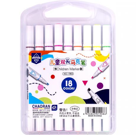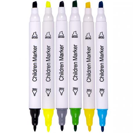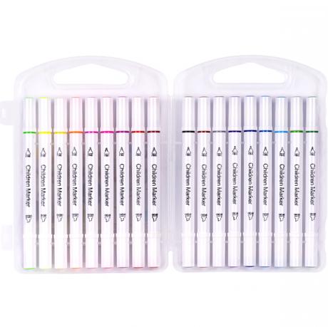 Фломастер двосторонній 18 кольорів "Children Marker" в пластиковому боксі на водній основі. З одного боку має тонке стандартне перо "Fine", з іншого товсте скошене "Broad". Це дозволяє промальовувати дрібні і великі деталі. Довжина фломастера з урахуванням ковпачків 13,5 см. Розмір упаковки 17 * 12,5 * 3см