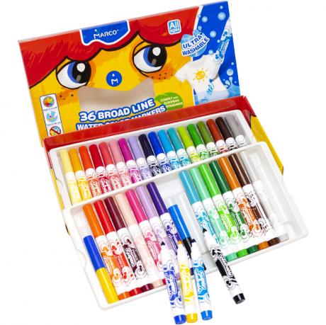 Фломастери MARCO JUMBO, призначені для малювання та розфарбовування, допоможуть вашому малюкові створити неповторні яскраві картинки. Комплект включає в себе фломастери 36 яскравих насичених кольорів в різнокольорових пластикових корпусах (колір корпусу відповідає кольору чорнил) .Наконечнікі фломастерів стійкі до підвищеного тиску і не розношуються згодом. Чорнило не токсичні і абсолютно безпечні, на водній основі, ідеально змиваються з рук і речей. Фломастери упаковані в коробку з европодвесом. Кругле вістрі фломастера 3,5 мм. Розмір фломастера 14,5х1,5см. Вік від 3-х років.