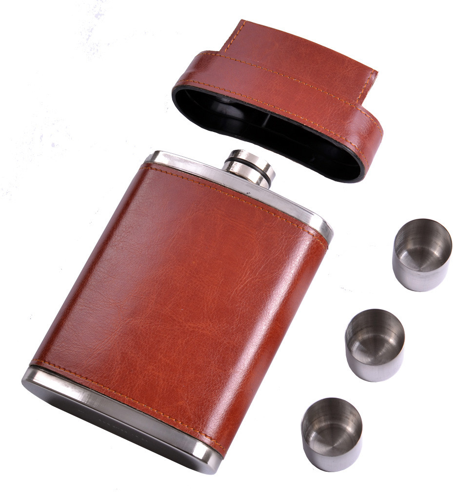 Фляга из пищевой нержавеющей стали обтянута кожей (256мл/ 9oz.) + рюмки BZ-9 Коричневая
