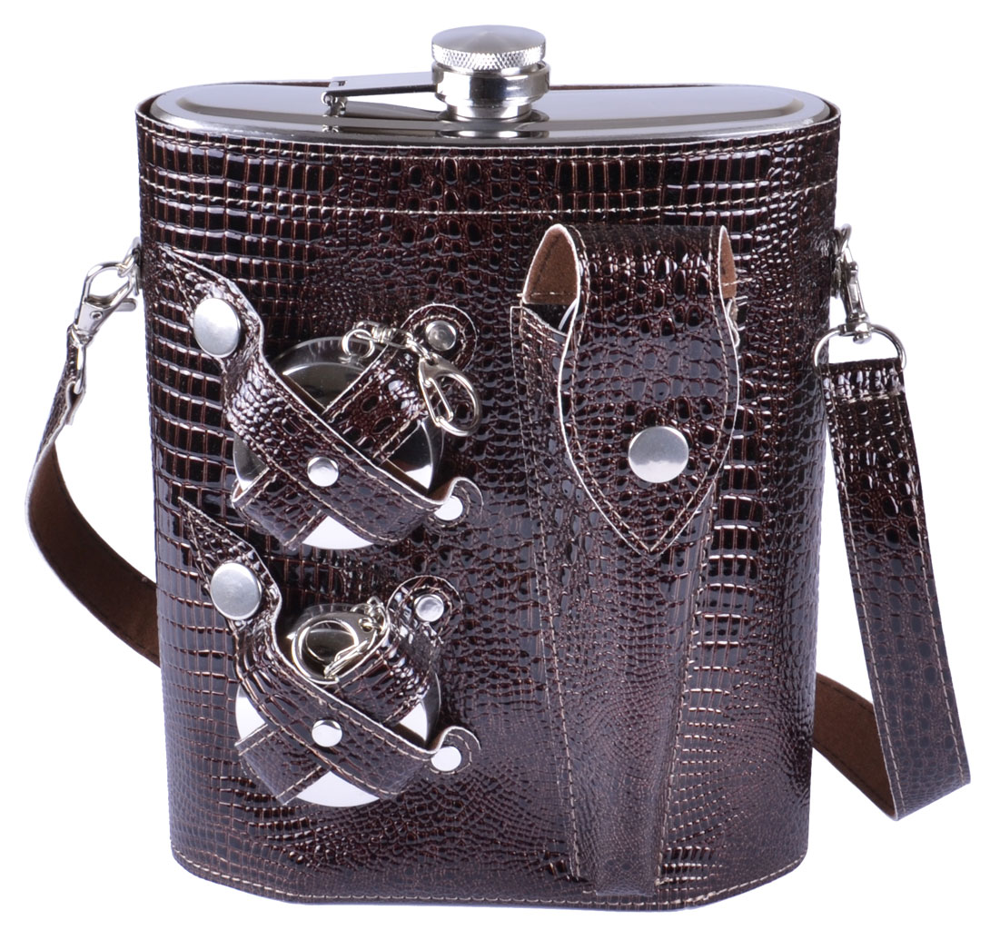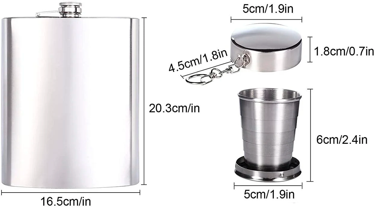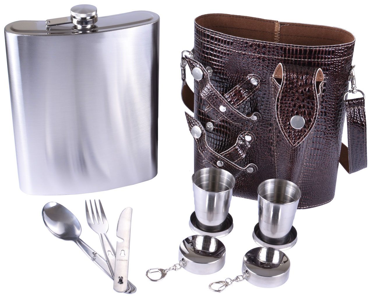В комплекте: фляжка, 2 раскладных стаканчика, набор столовых приборов (нож, вилка, ложка)