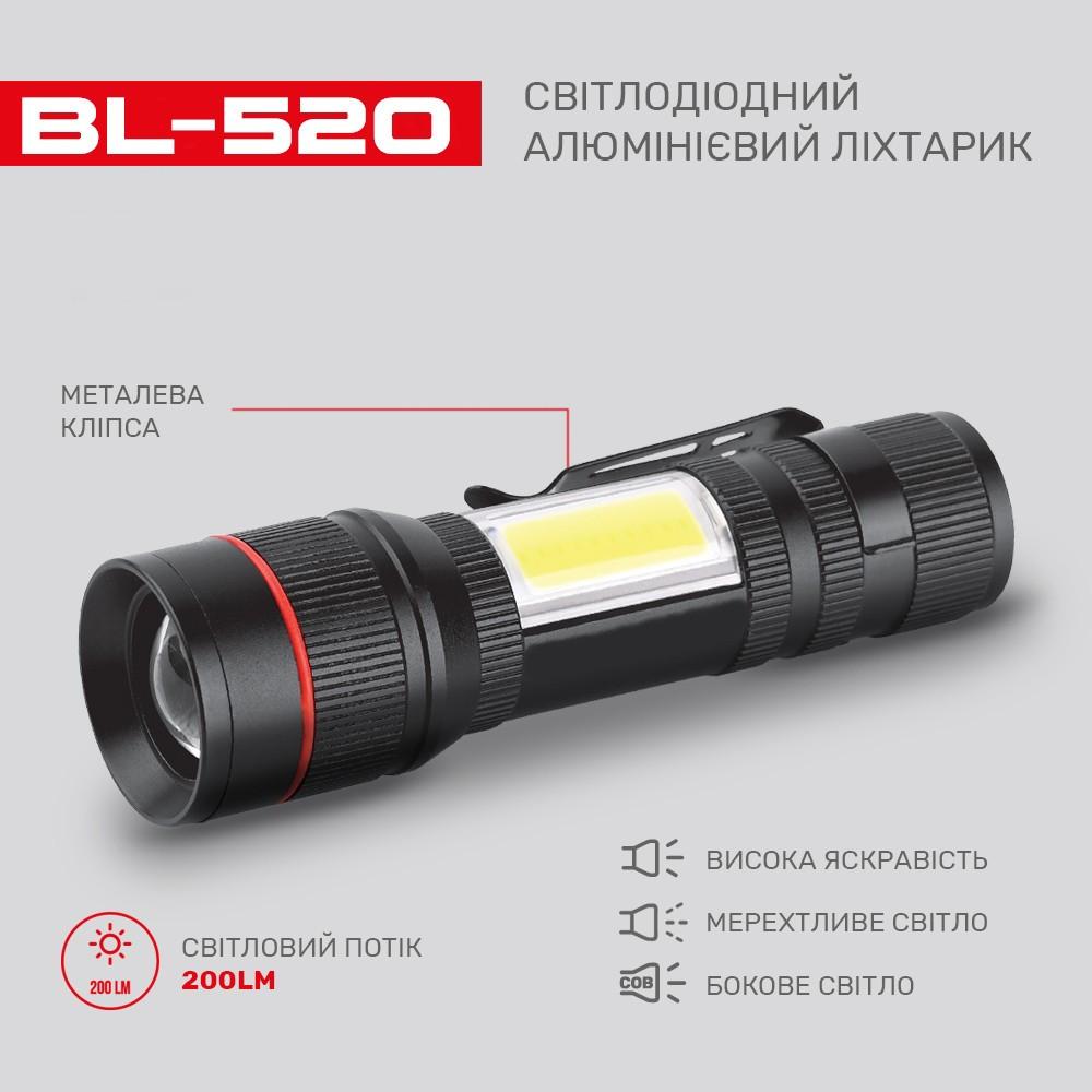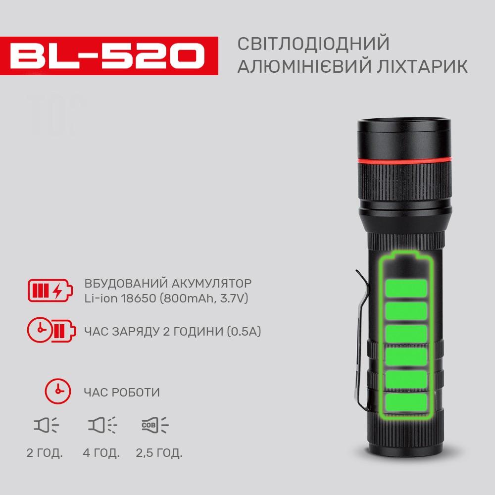 Фонарь BL-520-T6+COB, Li-Ion аккум., ЗУ microUSB, zoom, Box