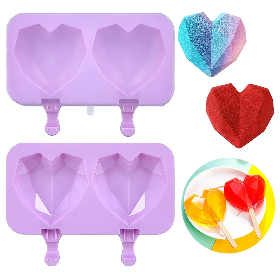 Форма силиконовая для мороженого из 2-х шт Сердце граненое с крышкой без палочек
