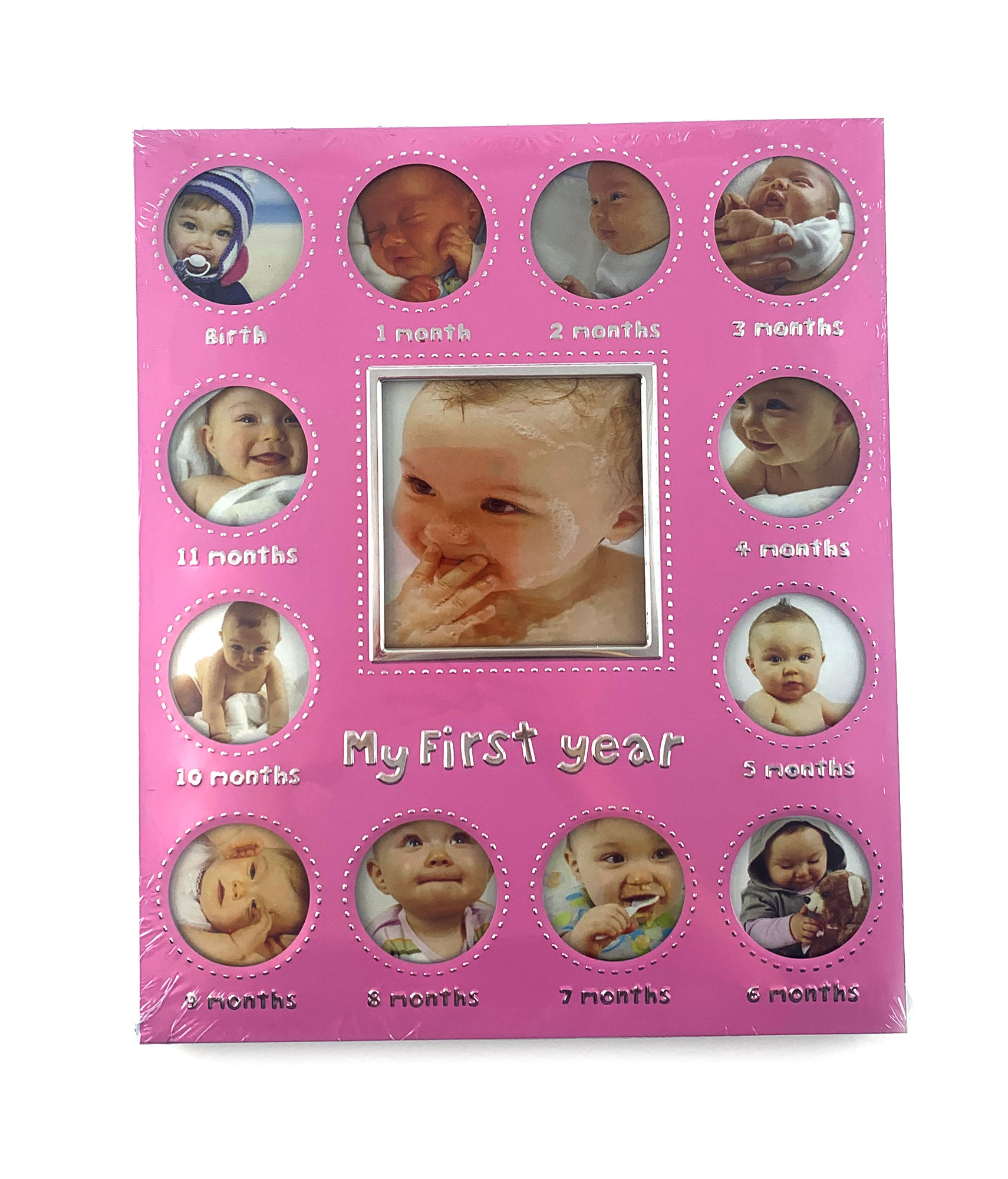 Фоторамка имеет размер 300х250х10 мм и выполнена в нежном розовом цвете, который придает ей неповторимую изящность и нежность. Внутри фоторамки расположены 13 мест под фотографии: 12 диаметром 45 мм и одно центральное место размером 90х85 мм. Здесь вы сможете разместить самые яркие и милые снимки вашего малыша, начиная с первых дней его жизни и до года.