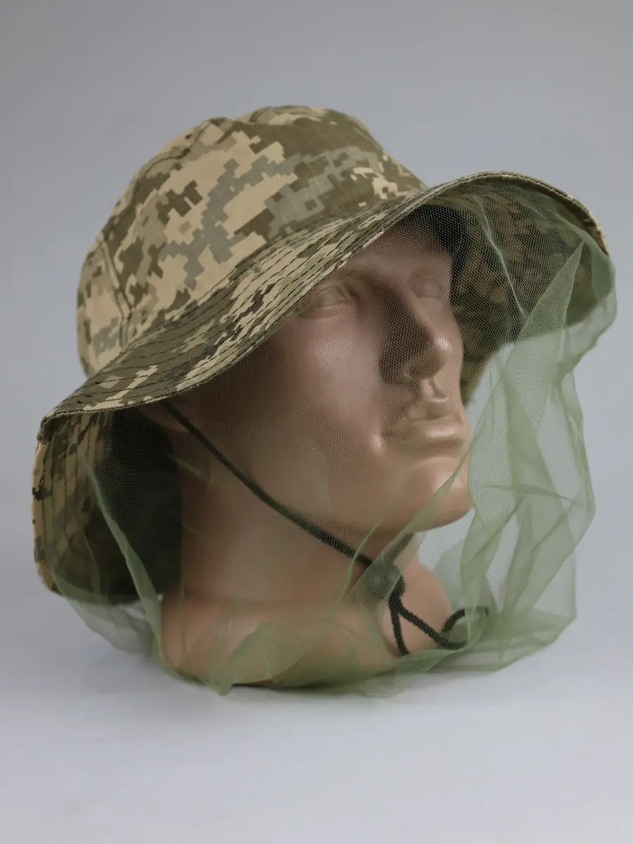 Камуфлированная панама с москитной сеткой защитит от солнца в жаркий день и от летающих насекомых.